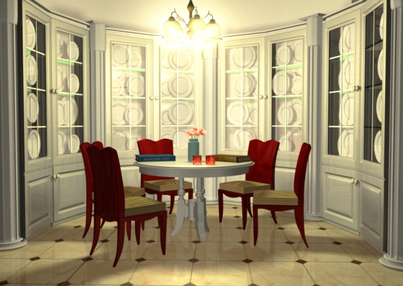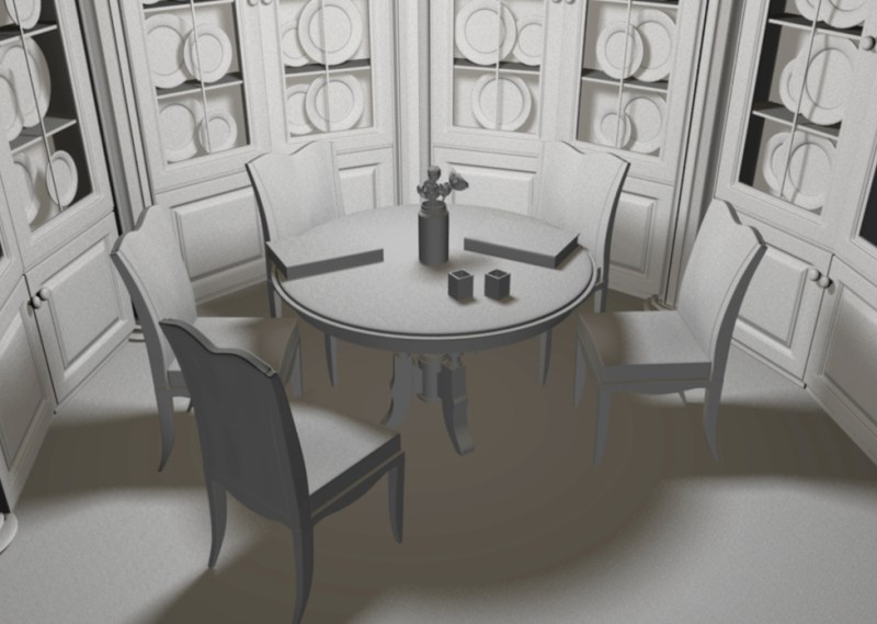 The reason why I choose to create a scene of old style of dining room was because it would be able to include many materials such as glass, metal, wood, fabric, and paper. In this way, I can practice the skill of applying materials better in Maya.